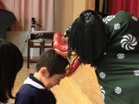 | 新年の伝統行事 「獅子舞」を行いました。 ホールの舞台の幕が開くと 和太鼓のリズムに合わせて 獅子が足を強く踏み鳴らしながら 舞台から降りてきて、 子どもたちはビックリ! |