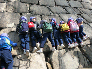 | 刻印された石が多数置かれている『刻印石の広場』で 色々な刻印を見つけました。 広場の横の石垣で、 石垣登りに挑戦しました。 子ども達のチャレンジにはちょうどよい難易度で、 手足を巧みに使い、 たくさんの子が登り切りました。 |
