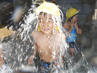 水鉄砲では、向こう側にいる友達と掛け合いを楽しんでいました。