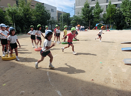 園庭では年少組の「イエーイ!」とポーズを楽しむ声が響き、