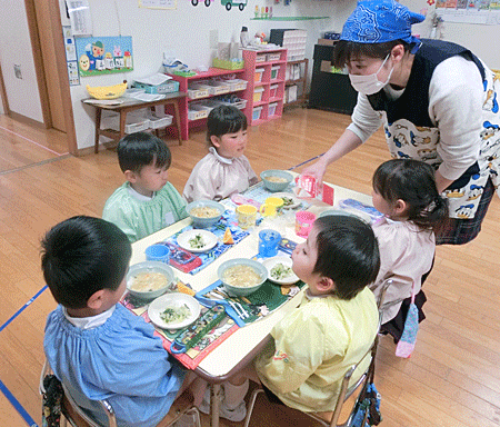 (年少組は21日から給食が始まります。楽しみにしていてくださいね。)