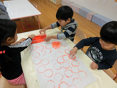 赤・黄・緑色の絵の具を使ってペタペタスタンプ。